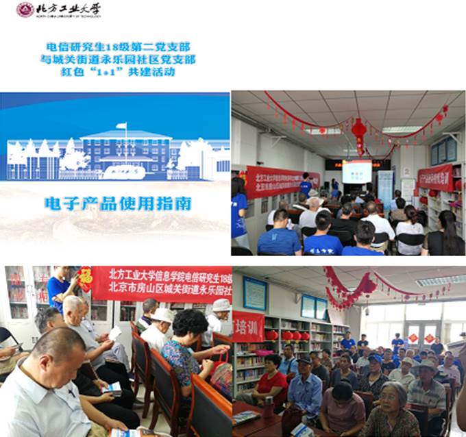 随着信息化时代的日益发展,电子产品应用越来越广泛,为人们的吃穿住行带来了便捷的同时,也在潜移默化中改变着人们的生活方式,在这种转变的过程中,老年人因思维习惯和接受新事物能力方面的限制阻碍了其享受这一大福利,老年人对便捷生活方式的渴望与不能熟练掌握电子产品的使用之间发生了矛盾,为此,近日,​伟德体育伟德体育官方网站电信研究生18级第二党支部与北京市房山区城关街道永乐园社区党支部开展了一场化解这一“矛盾”的红色“1+1”共建活动,为永乐园社区党支部老年党员们举办了一场题为“常用电子产品的使用指南”培训讲座,支部党员及积极分子20余人参加了此次活动。