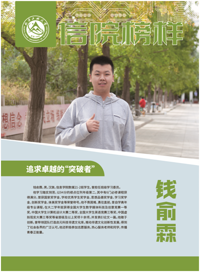 他敢于创新,曾带领团队打造启元科技非遗文化库,推动非遗文化创新性发展,得到了社会各界的广泛认可。他还积极参加志愿服务,热心服务老师和同学,传播青春正能量。