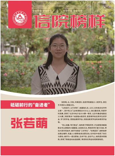 “以知促行、以行求知”,她基础扎实,以93.25的绩点位列专业第一,其中有23门必修课程达95分以上;她注重实践,热爱学科竞赛,获得了北京市电子设计大赛一等奖、北京市集成电路设计大赛二等奖等多个省部级A类奖项,曾获得公司优秀员工奖学金、学习奖学金、思想品德奖学金、实践创新奖学金和体育奖学金等。