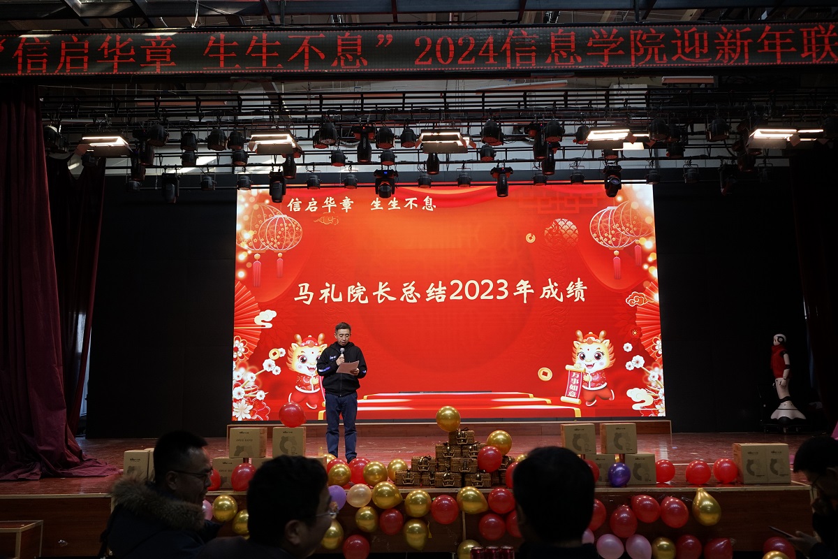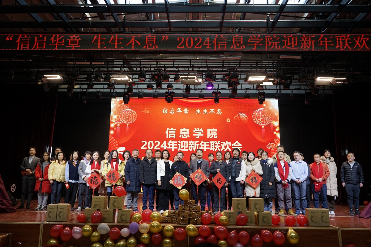 迎新年联欢会上,各个系、中心老师通过歌曲《少年》《外婆的澎湖湾》《青春舞曲》、诗朗诵《我爱上班》、人机舞蹈《舞动未来》《龙行龘龘贺新年》、创意视频配音节目《告白》以及现场毛笔字《送祝福》等节目,为大家来了欢歌笑语的同时,也把新春祝福送到了大家心坎里。