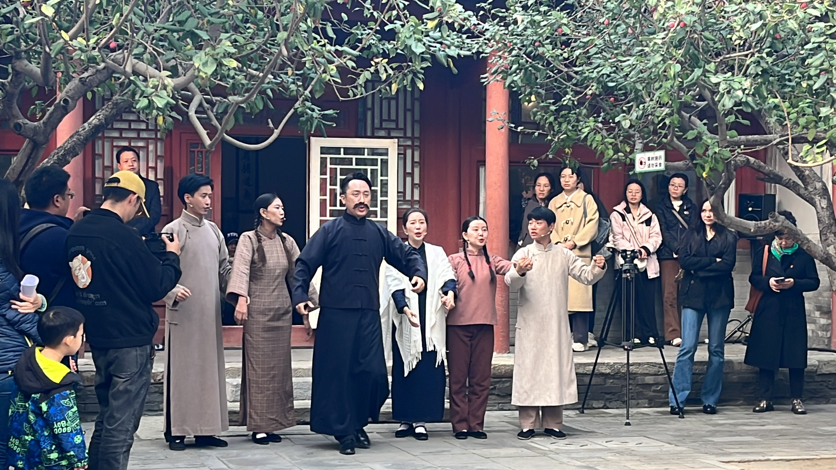 在合院中间现场沉浸式观看了话剧《守常先生》,身着民国时期服装的演员扮演李大钊、家人、同事和员工,通过对话式话剧唱腔,用饱满的情绪演绎着李大钊一个个鲜为人知的生活片段,让参观者身临其境地感受到李大钊与家人之间的生活温情、对子女的谆谆教诲、对反动势力的威武不屈、对中国共产党建立的坚定信念。
