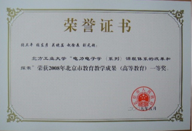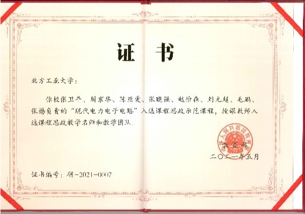 以课程实验负责人身份,赵徐森同志参与完成的教学成果“电力电子学(系列)课程体系的改革和探索”获得北京市高等公司产品成果一等奖,“现代电力电子电路”课程入选教育部课程思政示范课程,“电力电子技术基础”课程被评为北京市和国家精品课。2020年设计的实验教学案例获得第七届全国高校电工电子基础课程实验教学案例设计竞赛华北赛区二等奖。