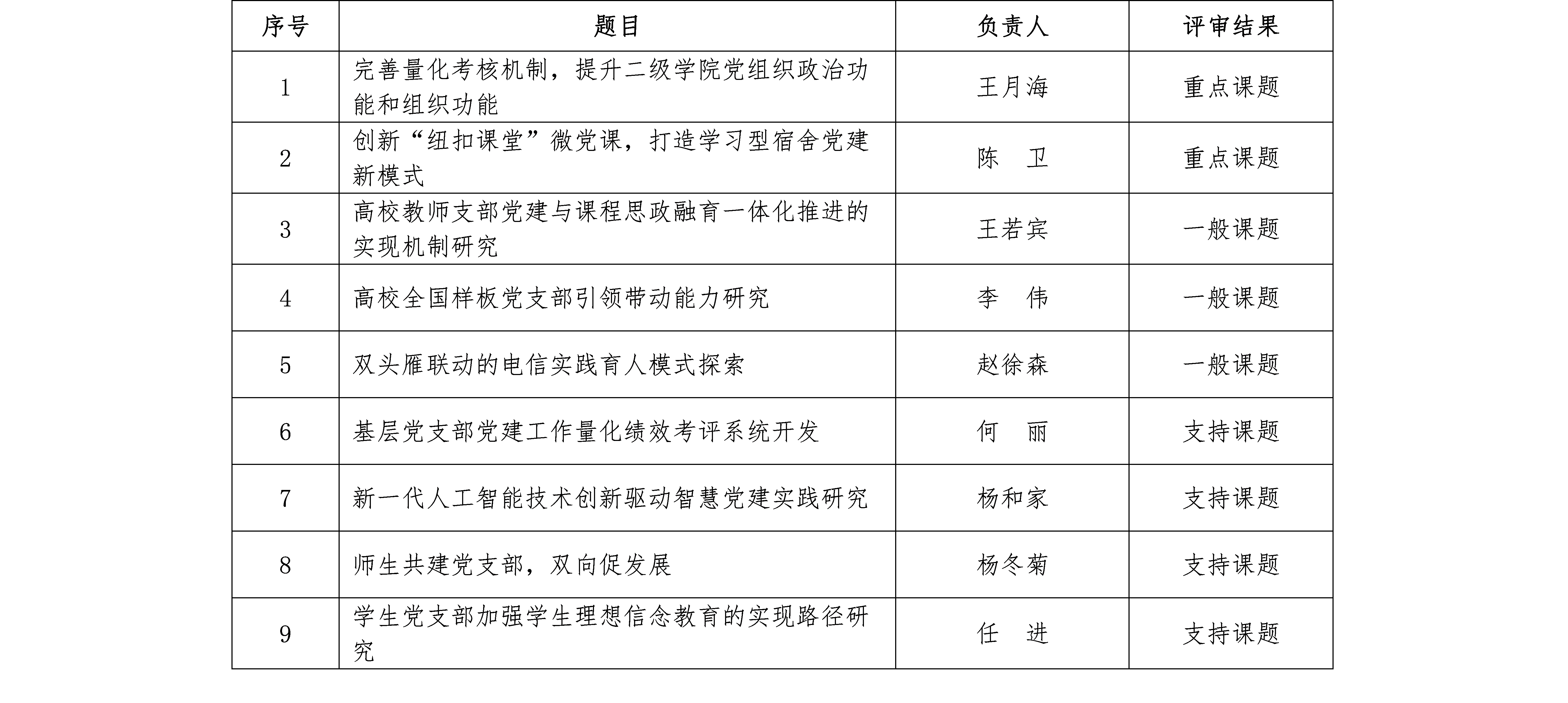 根据组织部《关于申报2023年度党建研究课题的通知》要求,经个人申报、二级单位党组织审核推荐、校内专家评审,评出校内重点课题5项,一般课题9项,支持课题19项。公司重点课题2项,一般课题3项,支持课题4项,共9项党建研究课题立项(详见附件1),课题研究期限为1年。